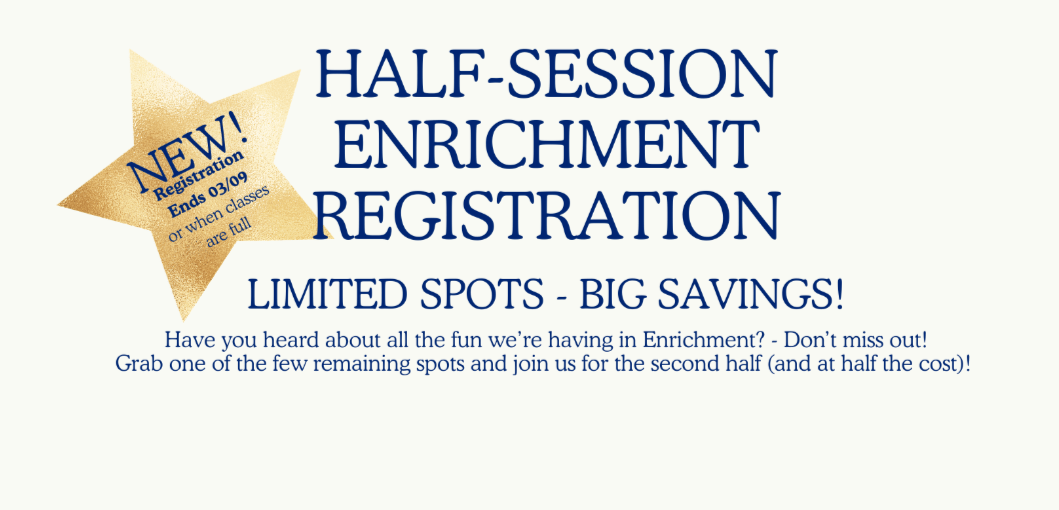 Spring 2026 Enrichment DatesJanuary 26-May 1 Each class will take place from 3:15 PM - 4:15 PM Please be mindful that there will be no Enrichment during Holiday Breaks or Conference Week. Enrichment CoursesRegistration for Enrichment courses is now open for all of the courses listed below. For more information about each, please look below to see if our courses would be a great fit for your student!Feel free to click on the photos to find out more information about specific courses!Registration will remain open until January 25th Alliance Theatre: Drama Workshop (K-3rd)Mondays OPENDance, sing, and act your way to becoming a triple threat! Students will learn proper singing techniques and basic choreography while using creative drama techniques to create and explore musical theater. Register Here STEAMgineer presents…. Pixel & Paint Lab: Where Art and Tech Collide (1st-5th)Mondays OPENAt Pixel & Paint Lab, we empower kids to explore their creativity through painting, art, coding, robotics, circuits, science, and AI. Every project builds confidence, problem-solving skills, and imagination for the future.Activities include:Painting & ColoringBuilding Art BotsCoding & CircuitsCreating AI-Animated CharactersLED Paper Circuit ArtScience labs and more! Register Here Art with Marietta Cobb Museum of ArtTuesdaysOPENLet’s explore what makes Art art! In this fun and creative class, students will learn about the 7 Elements of Art—like color, line, and shape—and the 8 Principles of Design, which help make pictures look balanced and exciting. Through playful projects using a variety of methods, kids will learn how to use these tools to make their own amazing works of art. Every class encourages imagination, creativity, and a love of artistic expression! ALL SUPPLIES ARE INCLUDED. Register Here Taekwondo (1st-5th)TuesdaysOPENTaekwondo is a fun way for children to get fit and to learn focus, discipline, respect, perseverance, and self-defense skills. Taekwondo is a Korean martial art that focuses on kicks, and our instructors are passionate about helping every student do their best to reach their potential. Our program focuses on TKD basics, as well as general fitness. Register Here Cheer Your Heart OutWednesdaysCheer Your Heart Out GA is cheerleading for everyone! Students will focus on the fundamentals of cheerleading including cheers, dance routines, jumps and stunts.This club is open to all grades(k-5), girls and boys! LEGO® Robotic Olympics Wednesdays This club will take your children through a journey in automation. Students will learn how to automate their LEGO® play using robotic functionality then apply those skills to build creations that can accomplish missions without any human guidance. Get ready for the semester-long exploration! Each day provides a new mission and opportunity to collaborate and compete with Builder Bunch. Mini Graphic Designers: T-Shirt Edition NEW! ThursdaysIn this hands-on creative design class, kids get to dream it, design it, and wear it! Participants learn the basics of graphic design, color, and composition as they create their own t-shirts! Using kid-friendly design tools, each student will sketch ideas, develop a personal logo or design theme, and bring their vision to life on real apparel. Along the way, they’ll explore self-expression, teamwork, and the pride of creating something uniquely theirs. Register Here SSA SoccerThursdaysOPENSSA After School Soccer sessions are for ALL players! The sessions will be for all grades boys and girls no matter the skill level. Our sessions are for players who are looking for extra exercise, players who have never played soccer before, players who play soccer recreationally and also players who play at the academy level. If you sign up to our program your son or daughter will have fun, learn the fundamentals of soccer, develop your skills in soccer but also learn skills for everyday life too!Register Here ChessFridaysOPENMake the right move for your child this school year! Chess develops your child's reading and math ability, critical and analytical thinking skills, and builds character and self-esteem. But don't tell the kids...they think chess is fun! Our Chess instructors and coaches are not only exceptional chess players themselves, but they have a passion for sharing their knowledge with children. They have years of chess playing experience, tournament experience, and the passion to keep the kids entertained!Register Here TennisFridaysOPENCrunch Time Tennis Kids is always focused on staying safe, learning and having fun while learning the fundamentals of this great sport. Register Here Pick-Up Information All students will go straight to their designated pick-up spot at their school once they are dismissed from their classes. When classes end, students will need to be picked up at 4:15 PM. Students who are not picked up by 4:20 will be taken to ASP and charged the daily rate for this program. The Pick-Up Location for Enrichment will be the Front Door of the School located outside of the Main Office. Students will be dismissed from the door as each parent and/or guardian arrives with the designated Pick-Up passes (will be passed out on Day 1). If you prefer not to pick up your child, or an emergency arises, you are welcome to use the After School Program for your student. For more information on ASP, please click the link below to find out more information & registration. *Please note that if you plan to use the After School Program at any point during the year, your child MUST be registered. It is recommended that you register even if you do not plan to use it just in case an issue ever arises.* ASP Registration