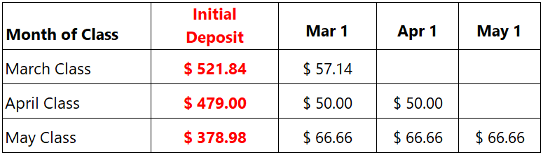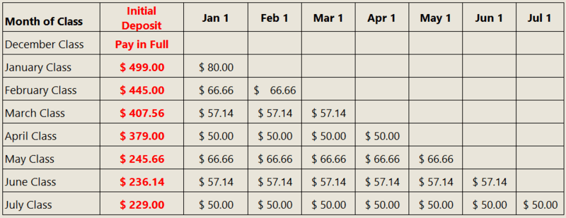 * The number of monthly payments is determined by the date in which the course registration opened. Therefore, if you register after a monthly payment has been collected, you will need to "catch up" by making payment for all previous installments due. The total amount due will be automatically calculated and collected at the time of registration. Register early to take advantage of the lowest upfront cost possible.