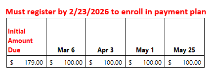 Families may choose to pay in full at the time of registration ($549) or may choose our Payment Plan Option with $179 due at registration and monthly payments of $100 due on the dates below for the remaining balance of the $579 Payment Plan Tuition cost.