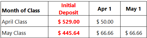 * The number of monthly payments is determined by the date in which the course registration opened. Therefore, if you register after a monthly payment has been collected, you will need to "catch up" by making payment for all previous installments due. The total amount due will be automatically calculated and collected at the time of registration. Register early to take advantage of the lowest upfront cost possible.