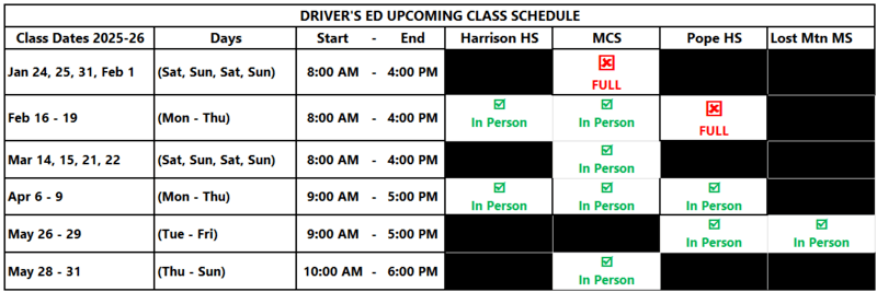 Marietta/Cobb Driver’s Education provides high quality, low cost instruction for teen drivers with the goal of saving lives. Programs are open to all teens ages 15 - 18, regardless of school or county affiliation.