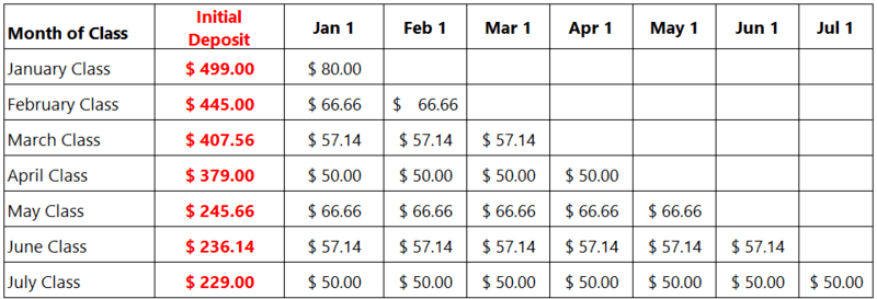 * The number of monthly payments and amount of monthly payments is determined by the date in which the course registration opened. Therefore, if you register after a monthly payment has been collected, you will need to "catch up" by making payment for all previous installments due. The total amount due will be automatically calculated and collected at the time of registration. Register early to take advantage of the lowest upfront cost possible.