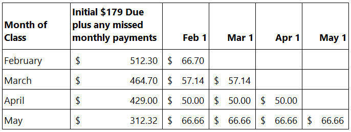 * The number of monthly payments is determined by the date in which the course registration opened. Therefore, if you register after a monthly payment has been collected, you will need to "catch up" by making payment for all previous installments due. The total amount due will be automatically calculated and collected at the time of registration. Register early to take advantage of the lowest upfront cost possible.