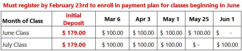 Families registering for SUMMER classes may choose to pay in full at the time of registration ($549) or may choose our Payment Plan Option with $179 due at registration and monthly payments of $100 due on the dates below for the remaining balance of the $579 Payment Plan Tuition cost. The balance must be paid in full prior to the start date of the class.