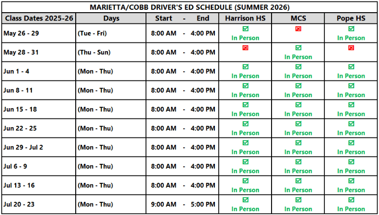 Marietta/Cobb Driver’s Education provides high quality, low cost instruction for teen drivers with the goal of saving lives. Programs are open to all teens ages 15 - 19, regardless of school or county affiliation.