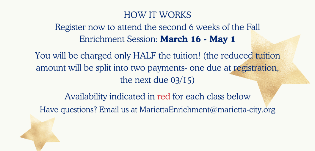 Marietta Community School is proud to offer a variety of enrichment classes for students after the school day has ended. These classes are fun, hands-on, and educational. Our enrichment courses are designed to reinforce the skills and knowledge your child needs to become a successful student both inside and outside of the classroom!Enrichment classes are typically 1 hour long, and allow students enough time to explore an interest and develop a skills over a 12-week course. To reduce the financial burden for families,12 week Enrichment Classes may be paid in full at the time of the registration or four installment payments. The first installment payment is due upon registration, the subsequent payments are due on 01/15, 02/15, and 03/15. Registration is a commitment for the full 12 weeks and all families are required to pay all installments of the 12 week tuition cost, regardless of class attendance. Spring 2026 Enrichment Dates January 26-May 1Each class will take place from 3:15 PM - 4:15 PMPlease be mindful that there will be no Enrichment during Holiday Breaks or Conference Week. Spring 2026 Enrichment Courses Registration for Enrichment courses is now open for all of the courses listed below. For more information about each, please look below to see if our courses would be a great fit for your student!Feel free to click on the photos to find out more information about specific courses!Registration will remain open until January 25. Elements of Art w/Marietta Cobb Museum of Art NEW!Mondays OPEN Let’s explore what makes art art! In this fun and creative class, students will learn about the 7 Elements of Art—like color, line, and shape—and the 8 Principles of Design, which help make pictures look balanced and exciting. Through playful projects using a variety of methods, kids will learn how to use these tools to make their own amazing works of art. Every class encourages imagination, creativity, and a love of artistic expression!Register Here. SSA SoccerTuesdays OPEN SSA is a Soccer Organization with an annual membership of over 9,000 kids in the state of Georgia. Our Central Branch will be offering an after school program with Marietta City Schools and participants will receive coaching and guidance from professionally licensed coaches.SSA After School Soccer sessions are for ALL players! The sessions will be for all grades boys and girls no matter the skill level. Our sessions are for players who are looking for extra exercise, players who have never played soccer before, players who play soccer recreationally and also players who play at the academy level. If you sign up to our program your son or daughter will have fun, learn the fundamentals of soccer, develop your skills in soccer but also learn skills for everyday life too!Register Here. CheerThursdays OPEN Cheer Your Heart Out GA is cheerleading for everyone! Students will focus on the fundamentals of cheerleading including cheers, dance routines, jumps and stunts.This club is open to all grades(k-5), girls and boysRegister Here. Pick-Up Registration All students will go straight to their designated pick-up spot at their school once they are dismissed from their classes. When classes end, students will need to be picked up 4:15 PM. Students who are not picked up by 4:20 will be taken to ASP and charged the daily rate for this program. The Pick-Up Location for Enrichment will be the Front Door of the School located outside of the Main Office. Students will be dismissed from the door as each parent and/or guardian arrives with the designated Pick-Up passes (will be missed on Day 1). If you prefer not to pick up your child, or an emergency arises, you are welcome to use the After School Program for your student. For more information on ASP, please click the link below to find out more information & registration. *Please note that if you plan to use the After School Program at any point during the year, your child MUST be registered. It is recommended that you register even if you do not plan to use it just in case an issue ever arises.* ASP Registration