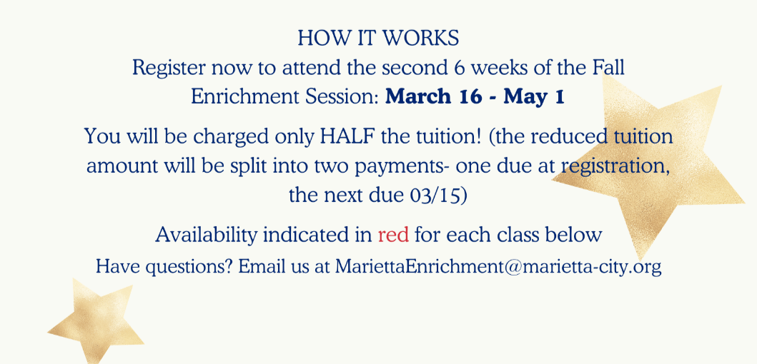 Spring 2026January 26-May 1 Mark your calendar with the specific dates of the classes you sign up for at registration!When does registration end?Registration for each class will end a week before it's scheduled to start.Will classes meet when school is out?No, class will not meet during school holidays. Classes will also be rescheduled for inclement weather and any other phenomenon that postpones the normal school day.How long are the classes?Classes are 1 hour each and start after dismissal. Please check your school for the specific start and end timesHow long are the sessions?Sessions last for 12 weeks. What is the cost?The cost of each course is different. To reduce the financial burden for families,12 week Enrichment Classes may be paid in full at the time of the registration or four installment payments. The first installment payment is due upon registration, the subsequent payments are due on 01/15, 02/15, and 03/15. Registration is a commitment for the full 12 weeks and all families are required to pay all installments of the 12 week tuition cost, regardless of class attendance.Click your school's picture below to learn more! A.L. Burruss Enrichment ClassesCheer Your Heart OutSTEAMgineerLego™ Robotic OlympicsAlliance Theatre: Drama WorkshopMini Graphic Designers: T-Shirt Edition Art with Marietta Cobb Museum of ArtTaekwondoTennis +PickleballSSA SoccerChess Dunleith Enrichment ClassesArt with Marietta Cobb Museum of ArtSSA SoccerLego™: Robotic Olympics Emily Lembeck ELC Enrichment ClassesSpanishTennisBallet and Tap (Yearlong)Builder Bunch (Lego)SoccerAlliance Theatre: Drama Workshop Hickory Hills Enrichment ClassesKidsTV: Filmmaking and Video ProductionTennis + PickleballSSA SoccerArt with Marietta Cobb Museum of ArtChessYogaCheer Your Heart OutTaekwondoLEGO® Robotic Olympics ClubSTEAMgineer*NEW* Find Your Inner Author: Share Your Story Lockheed Enrichment ClassesDance Your Heart Out MCAA Enrichment Classes*NEW* Art with Marietta Cobb Museum of Art Tennis + PickleballSTEAMgineerKidsTV: Filmmaking and Video ProductionCheer Your Heart OutChessCobb SoccerLEGO® Robotic Olympics ClubSpanishBasketballYoung CEO Sawyer Road Enrichment Classes *NEW* Art with Marietta Cobb Museum of Art SSA SoccerTaekwondoCheer Your Heart Out West Side Enrichment Classes Beginner's ChessAdvanced ChessSSA SoccerTennisSTEAMgineerSpanishYogaArt with Marietta Cobb Museum of ArtPickleballAlliance TheatreCheer Your Heart OutLEGO® Robotic Olympics ClubAll Star SportsYoung CEO *NEW*